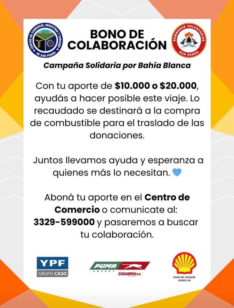 Nos sumamos a esta campaña colaborando junto a las estaciones de servicio de San Pedro, con el combustible para el traslado de las donaciones recibidas en la campaña, y te invitamos a participar comprando bonos para hacer posible el viaje.